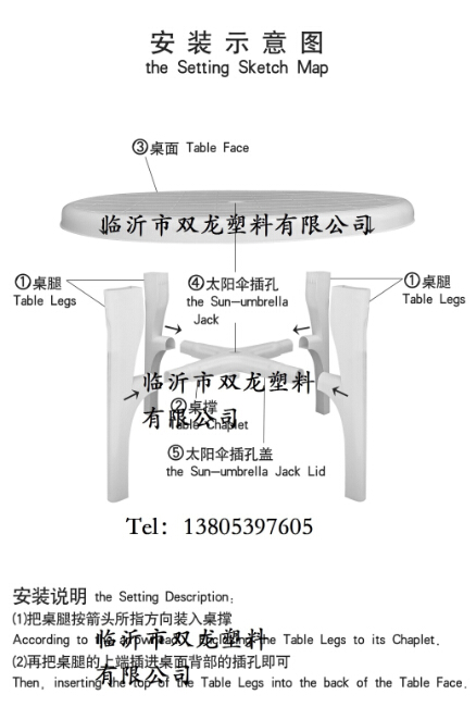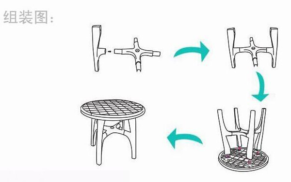 關於拚裝通過下麵的示意(yì)圖可以看出基本的步驟。實際操作(zuò)中首先(xiān)是桌腿與桌撐的組合,通過預留的卡槽,首先手持桌(zhuō)撐(chēng)將桌腿卡入,一次重(chóng)複(fù)四次將四條桌腿(tuǐ)安裝完畢。然(rán)後將桌麵反(fǎn)向放(fàng)置(zhì)於平整地麵,將(jiāng)組合好的桌腿與桌撐(chēng),對準卡槽(cáo),推入四條桌腿(tuǐ),這樣(yàng)一個(gè)完整的塑料桌子就組裝好了。拆卸過程同樣簡單,指示(shì)把上述流(liú)程反向操(cāo)作即可。